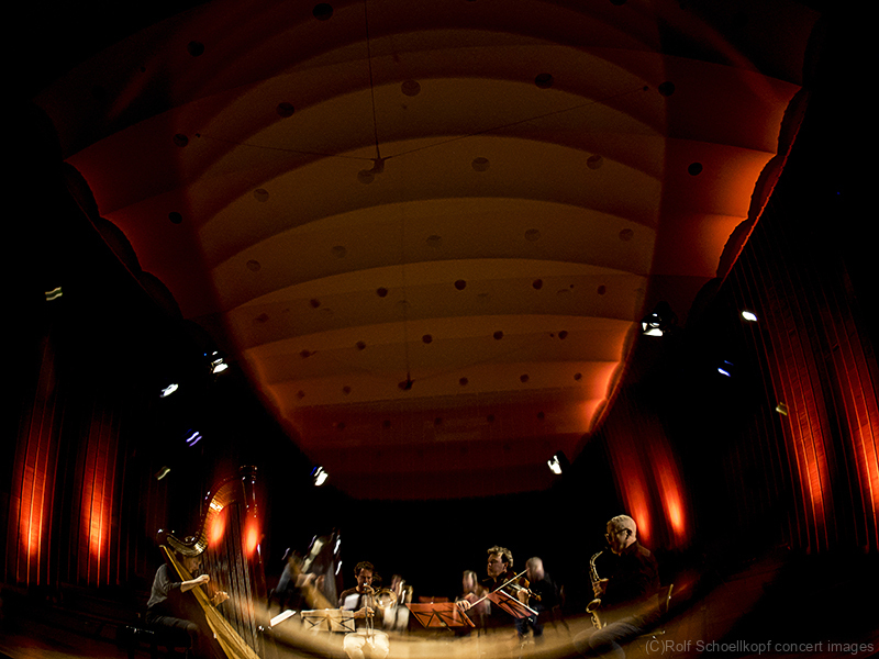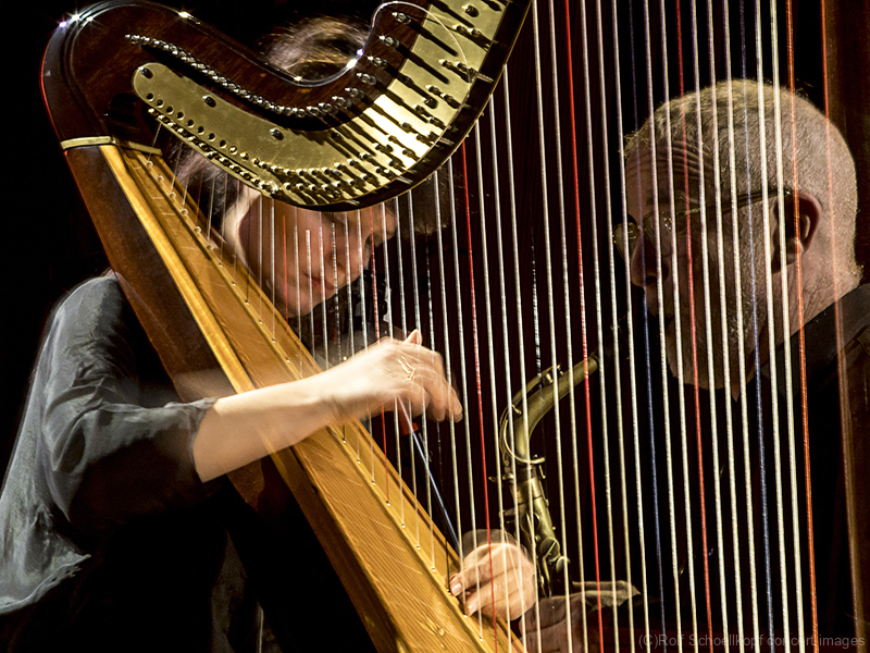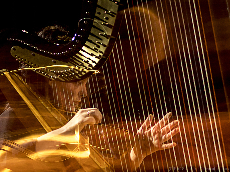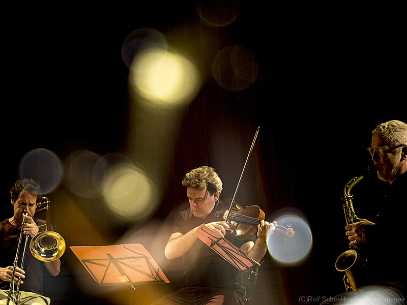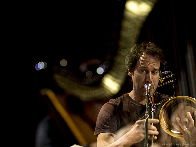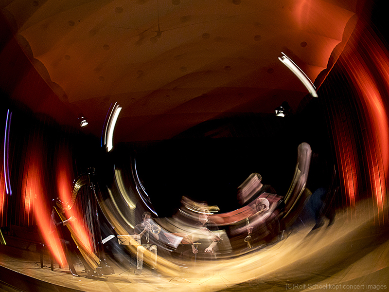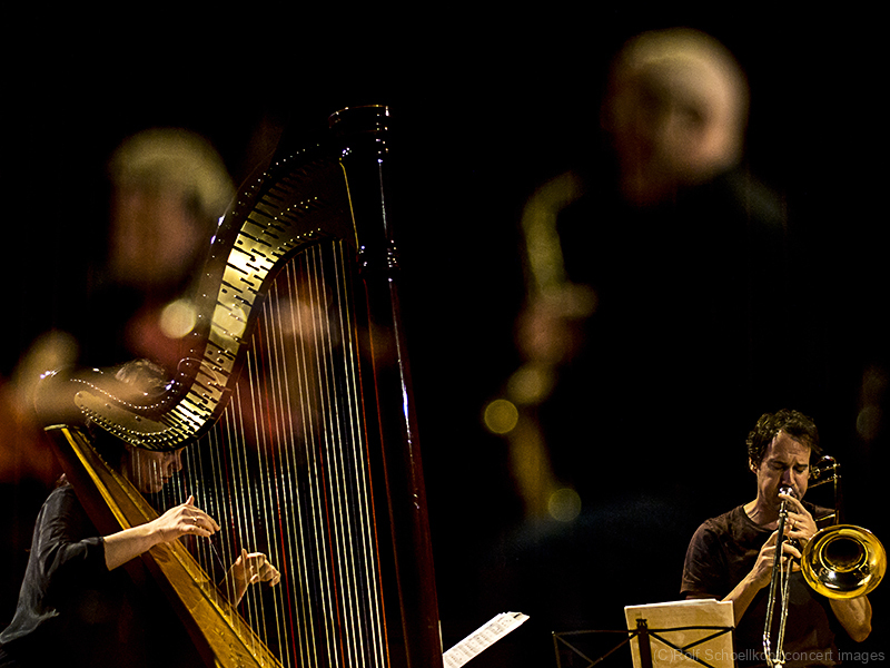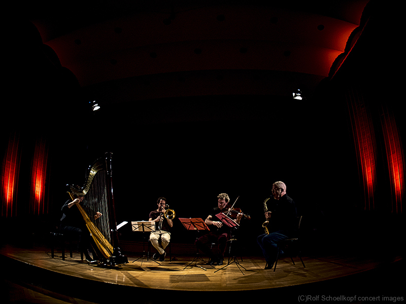 LINE UP Nils Wogram – Posaune | Kathrin Pechlof – Harfe | Gareth Lubbe – Viola, Violine, Obertongesang | Hayden Chisholm – Altsaxophon | LichtDesign: Christoph Kattner